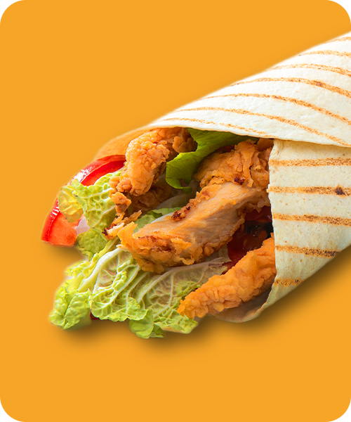 Тортилья, огурцы, халапеньо, помидоры, листья салата, красный лук, наггетсы, соус Фирменный